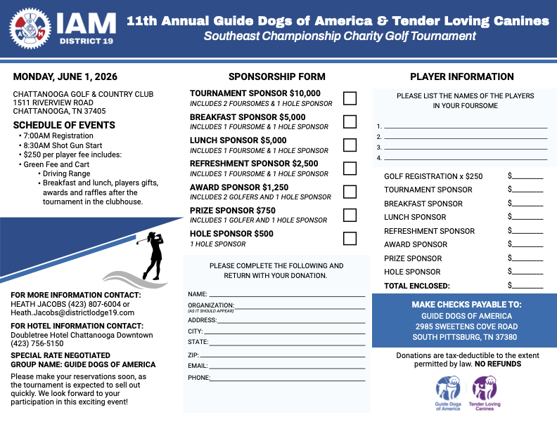 Our Sisters and Brothers at District 19 are hosting their 11th Annual Guide Dogs of America | Tender Loving Canines Southeast Championship Charity Golf Tournament in June! If you are interested in participating, you’ll find all the details in the flyer below!! DOWNLOAD/PRINT PDF VERSION OF THIS BULLETIN POST ON ALL IAM BULLETIN BOARDS