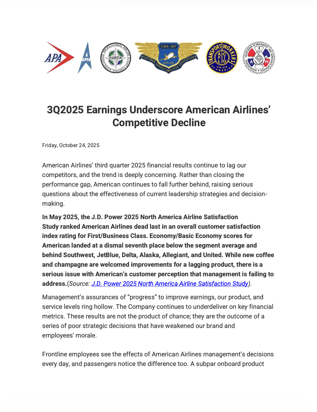 3Q2025 Earnings Underscore American Airlines’ Competitive Decline