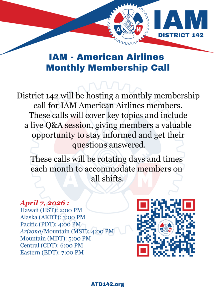 District 142 is starting a monthly IAM Membership Engagement Webinar for our Maintenance & Related members at American Airlines. This includes all members represented in the M&R, MLS, MCT, and MTS Collective Bargaining Agreements (CBAs).